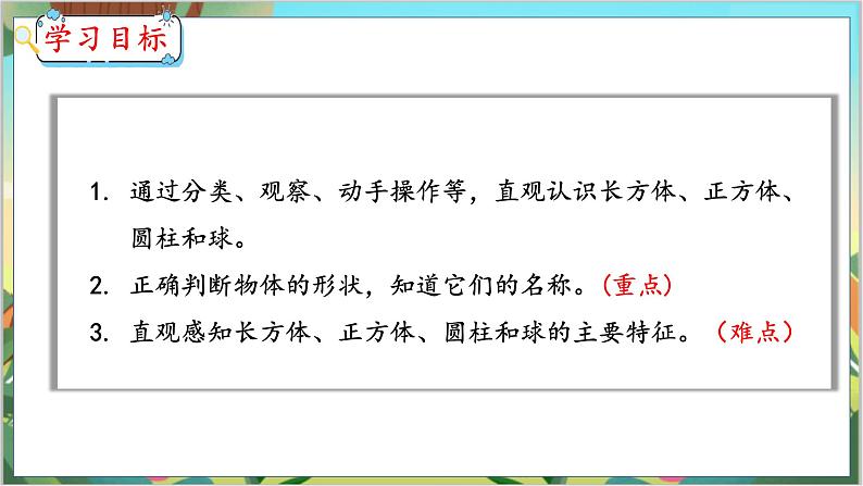 1. 通过分类、观察、动手操作等,直观认识长方体、正方体、 圆柱和球。2. 正确判断物体的形状,知道它们的名称。(重点)3. 直观感知长方体、正方体、圆柱和球的主要特征。(难点)