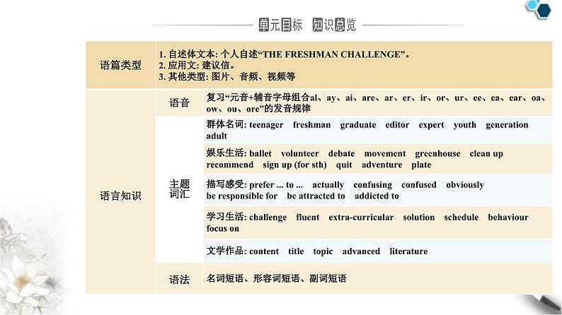 这是一份高中英语人教版 (2019)必修 第一册Unit 1 Teenage life教学ppt课件,共9页。PPT课件主要包含了青少年,青少年的十几岁的,芭蕾舞,志愿者,辩论争论,较喜欢,眼球运动,温室暖房,合适的适用的,事实上等内容,欢迎下载使用。