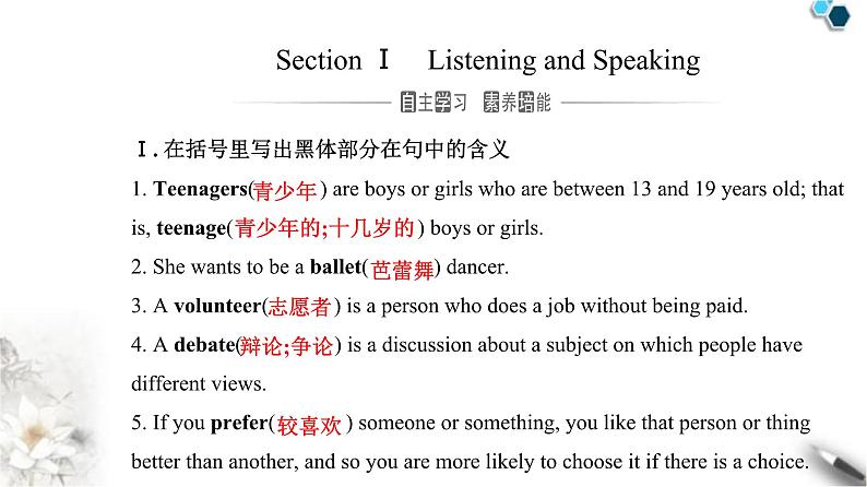 Ⅰ. 在括号里写出黑体部分在句中的含义1. Teenagers( ) are bys r girls wh are between 13 and 19 years ld; that is, teenage( ) bys r girls.2. She wants t be a ballet( ) dancer.3. A vlunteer( ) is a persn wh des a jb withut being paid.4. A debate( ) is a discussin abut a subject n which peple have different views.5. If yu prefer( ) smene r smething, yu like that persn r thing better than anther, and s yu are mre likely t chse it if there is a chice.