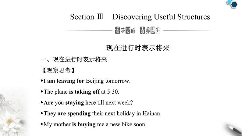 这是一份人教版 (2019)必修 第一册Unit 2 Travelling around图片ppt课件,共18页。PPT课件主要包含了课前·基础认知,课堂·重难突破,随堂训练 ,语 法 图 解,现在进行时表示将来 ,探 究 发 现,语 法 精 析,即 学 即 练,begins,arrives等内容,欢迎下载使用。