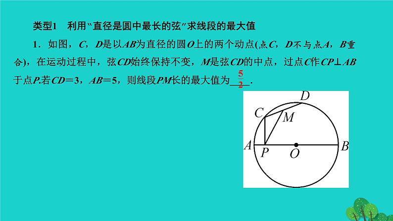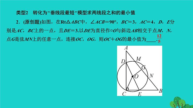 这是一份第24章 圆-专题训练:巧用圆的性质求线段(和)的最值 人教版数学九年级上册作业课件,共7页。