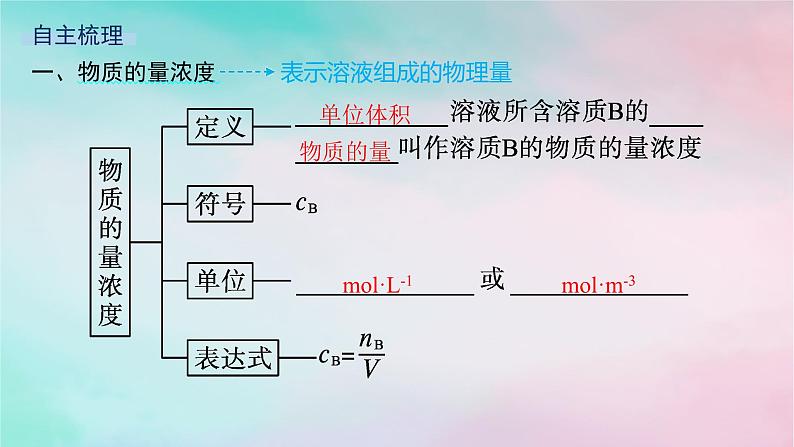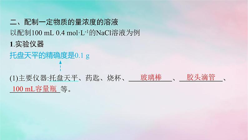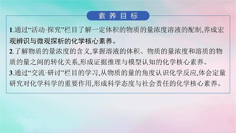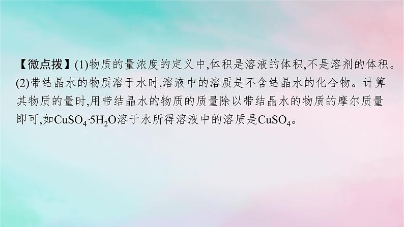 第1章 认识化学科学第3节 第3课时 物质的量浓度素 养 目 标1.通过“活动·探究”栏目了解一定体积的物质的量浓度溶液的配制,养成宏观辨识与微观探析的化学核心素养。2.了解物质的量浓度的含义,掌握溶液的体积、物质的量浓度和溶质的物质的量之间的转化关系,形成证据推理与模型认知的化学核心素养。3.通过“交流·研讨”栏目的学习,从物质的量的角度认识化学反应,体会定量研究对化学科学的重要作用,形成科学态度与社会责任的化学核心素养。基础落实·必备知识全过关重难探究·能力素养全提升目 录 索 引 学以致用·随堂检测全达标基础落实·必备知识全过关一、物质的量浓度 表示溶液组成的物理量 单位体积 物质的量 mol·L-1 mol·m-3 【微点拨】(1)物质的量浓度的定义中,体积是溶液的体积,不是溶剂的体积。(2)带结晶水的物质溶于水时,溶液中的溶质是不含结晶水的化合物。计算其物质的量时,用带结晶水的物质的质量除以带结晶水的物质的摩尔质量即可,如CuSO4·5H2O溶于水所得溶液中的溶质是CuSO4。二、配制一定物质的量浓度的溶液以配制100 mL 0.4 mol·L-1的NaCl溶液为例1.实验仪器托盘天平的精确度是0.1 g(1)主要仪器:托盘天平、药匙、烧杯、 、 、 等。 玻璃棒 胶头滴管 100 mL容量瓶 (2)容量瓶: 温度 容积 刻度线 500 mL 1 000 mL 2.配制过程(1)计算、称量:需要NaCl固体的质量为 g,实际用托盘天平称量的质量为 g。 (2)溶解:溶解过程中玻璃棒的作用为 。 (3)移液、振荡。①移液前需要将溶液 。 ②移液中玻璃棒的作用为 。 ③振荡前需要进行的操作为 。(4)定容。①当液面离容量瓶颈刻度线 时改用 滴加蒸馏水。②定容标准:溶液凹液面最低处与 相切。 (5)摇匀:方法为盖好瓶塞,反复上下颠倒。2.34 2.3 搅拌,加速溶解 冷却至室温 引流 将烧杯和玻璃棒洗涤2~3次,并将洗涤液注入容量瓶中 1~2 cm 胶头滴管 刻度线 【微思考1】如何检查容量瓶是否漏水? 【微思考2】(1)能否将固体或浓溶液直接放在容量瓶中溶解或稀释?(2)容量瓶的使用有哪些注意事项? 提示 向容量瓶中注入一定量的蒸馏水,盖好瓶塞。用一只手食指按住瓶塞,另一只手托住瓶底,将瓶倒立,观察瓶塞处是否漏水。如不漏水,将瓶正立并将塞子旋转180°后塞紧,再次倒立检查是否漏水,如不漏水,才能使用。 提示 (1)不能。因为溶解时可能会有溶解热,可能造成溶液的体积有误差,从而使配制的溶液浓度不准确,应先在烧杯中冷却后再转移至容量瓶中。(2)使用容量瓶的“五不”原则:不能进行加热;不能进行溶解;不能进行稀释;不能作为反应容器;不能长时间贮存溶液。容量瓶在使用前,除洗涤外还应检查瓶塞处是否漏水。判断下列说法是否正确,正确的画“√”,错误的画“×”。1.从100 mL 5 mol·L-1 H2SO4溶液中取出了10 mL,所得硫酸的物质的量浓度为0.5 mol·L-1。( )2.标准状况下22.4 L HCl溶于1 L水,盐酸的物质的量浓度为1 mol·L-1。( )3.将25 g CuSO4·5H2O晶体溶于75 g水中所得溶质的质量分数为25%。( )4.同浓度的三种溶液:Na2SO4、MgSO4、Al2(SO4)3,其体积比为3∶2∶1,则 浓度之比为3∶2∶3。( )5.将31 g Na2O溶于水,配成1 L溶液,c(Na2O)=0.5 mol·L-1。( )×××××6.将1 mol·L-1的NaCl溶液和0.5 mol·L-1的BaCl2溶液等体积混合后,不考虑体积变化,c(Cl-)=0.75 mol·L-1。( )7.1 L水中溶解4.0 g NaOH所形成的溶液中,溶质的物质的量浓度是0.1 mol·L-1。( )8.洗干净的容量瓶不需要干燥,可以直接使用。( )××√重难探究·能力素养全提升探究1 有关物质的量浓度的计算如图所示为实验室浓硫酸试剂瓶上的标签。 (1)在图示的浓硫酸试剂瓶标签中,哪个物理量是描述溶液组成的? (2)若取1 L这种浓硫酸,其中含有溶质的质量是多少?物质的量是多少? 提示 质量分数是描述溶液组成的物理量。提示 1 L这种浓硫酸中所含硫酸的质量为:1 000 mL×1.84 g·cm-3×98%=1 803.2 g。(3)根据物质的量浓度的定义计算该浓硫酸的物质的量浓度。 (4)试找出溶质的质量分数与物质的量浓度的关系式。 物质的量浓度的基本计算方法(1)有关物质的量浓度的基本计算要充分利用物质的量的四个基本公式。(2)已知一定体积溶液中溶质的质量或粒子的数目,求其物质的量浓度。①若已知溶质的质量m:m→n→c②若已知溶质粒子的数目N:N→n→c(3)已知标准状况下V L气体溶于水后形成溶液的体积为V溶液,求其物质的量浓度。①若已知溶液的体积V溶液:V→n→c②若已知溶液的密度ρ和溶液的质量m溶液(4)溶液稀释或混合后,溶质物质的量浓度的计算。①溶质的物质的量不变。根据c1V1=c2V2计算(c1、c2分别为稀释前后溶液的物质的量浓度,V1、V2分别为稀释前后溶液的体积)。②相同溶质的不同物质的量浓度的溶液混合。混合后溶质的总物质的量不变,可根据c1V1+c2V2=c(混)·V(混)计算混合后溶液中溶质的物质的量浓度[c(混)为混合后溶液的物质的量浓度,V(混)为混合后溶液的体积]。1.某试剂瓶上贴有如下标签,对该试剂理解正确的是( ) 1.0 mol·L-1 NaCl溶液A.该溶液中含有的微粒主要有:NaCl、Na+、Cl-、H2OB.若取50 mL该溶液,其中的c(Cl-)=0.05 mol·L-1C.若取该溶液与100 mL 0.1 mol·L-1 AgNO3溶液完全反应,需要取该溶液10 mLD.该溶液与1.0 mol·L-1 Na2SO4溶液中的c(Na+)相等C解析 氯化钠溶液中不存在NaCl粒子,A错误;溶液是均一、稳定的,若取50 mL该溶液,其中c(Cl-)=1.0 mol·L-1,B错误;100 mL 0.1 mol·L-1 AgNO3溶液中Ag+的物质的量是0.01 mol,完全反应消耗氯