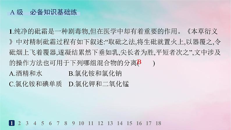 展开1.纯净的砒霜是一种剧毒物,但在医学中却有着重要的作用。《本草衍义》中对精制砒霜过程有如下叙述:“取砒之法,将生砒就置火上,以器覆之,令砒烟上飞着覆器,遂凝结累然下垂如乳,尖长者为胜,平短者次之”,文中涉及的操作方法也可用于下列哪组混合物的分离( )A.酒精和水B.氯化铵和氯化钠C.氯化铵和碘单质D.氯化钾和二氧化锰