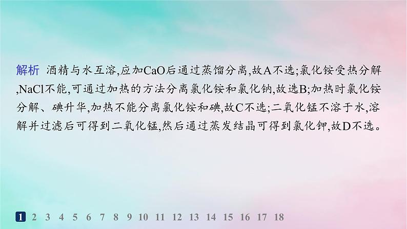 解析 酒精与水互溶,应加CaO后通过蒸馏分离,故A不选;氯化铵受热分解,NaCl不能,可通过加热的方法分离氯化铵和氯化钠,故选B;加热时氯化铵分解、碘升华,加热不能分离氯化铵和碘,故C不选;二氧化锰不溶于水,溶解并过滤后可得到二氧化锰,然后通过蒸发结晶可得到氯化钾,故D不选。