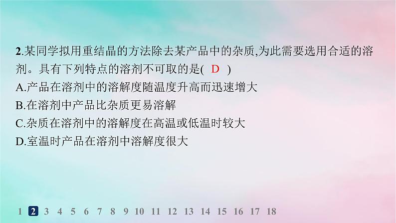 2.某同学拟用重结晶的方法除去某产品中的杂质,为此需要选用合适的溶剂。具有下列特点的溶剂不可取的是( )A.产品在溶剂中的溶解度随温度升高而迅速增大B.在溶剂中产品比杂质更易溶解C.杂质在溶剂中的溶解度在高温或低温时较大D.室温时产品在溶剂中溶解度很大