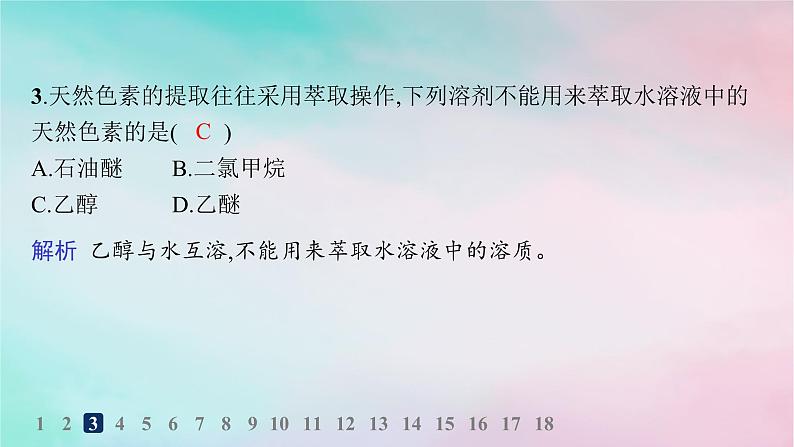 3.天然色素的提取往往采用萃取操作,下列溶剂不能用来萃取水溶液中的天然色素的是( )A.石油醚B.二氯甲烷C.乙醇D.乙醚