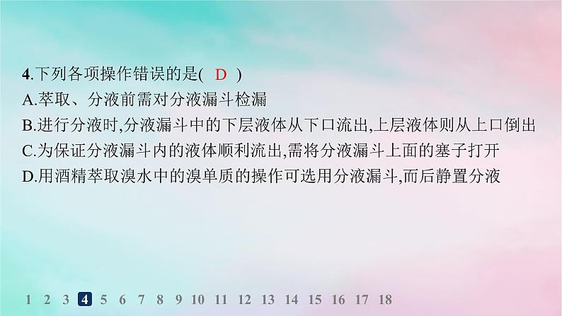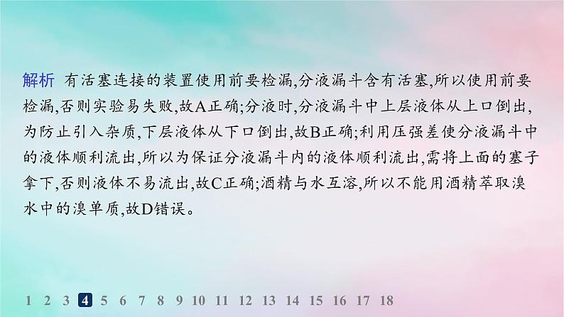 解析 有活塞连接的装置使用前要检漏,分液漏斗含有活塞,所以使用前要检漏,否则实验易失败,故A正确;分液时,分液漏斗中上层液体从上口倒出,为防止引入杂质,下层液体从下口倒出,故B正确;利用压强差使分液漏斗中的液体顺利流出,所以为保证分液漏斗内的液体顺利流出,需将上面的塞子拿下,否则液体不易流出,故C正确;酒精与水互溶,所以不能用酒精萃取溴水中的溴单质,故D错误。