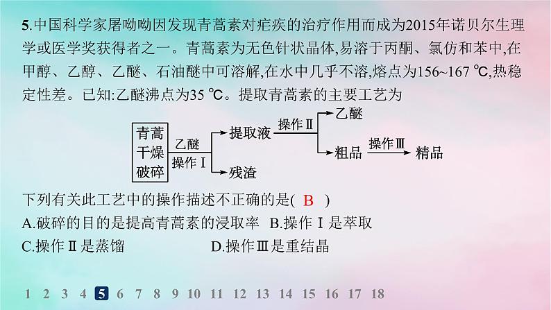 5.中国科学家屠呦呦因发现青蒿素对疟疾的治疗作用而成为2015年诺贝尔生理学或医学奖获得者之一。青蒿素为无色针状晶体,易溶于丙酮、氯仿和苯中,在甲醇、乙醇、乙醚、石油醚中可溶解,在水中几乎不溶,熔点为156~167 ℃,热稳定性差。已知:乙醚沸点为35 ℃。提取青蒿素的主要工艺为