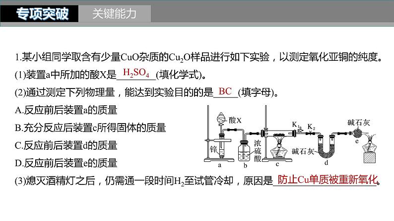 1.某小组同学取含有少量CuO杂质的Cu2O样品进行如下实验,以测定氧化亚铜的纯度。(1)装置a中所加的酸X是________(填化学式)。(2)通过测定下列物理量,能达到实验目的的是_____(填字母)。A.反应前后装置a的质量B.充分反应后装置c所得固体的质量C.反应前后装置d的质量D.反应前后装置e的质量(3)熄灭酒精灯之后,仍需通一段时间H2至试管冷却,原因是_____________________。