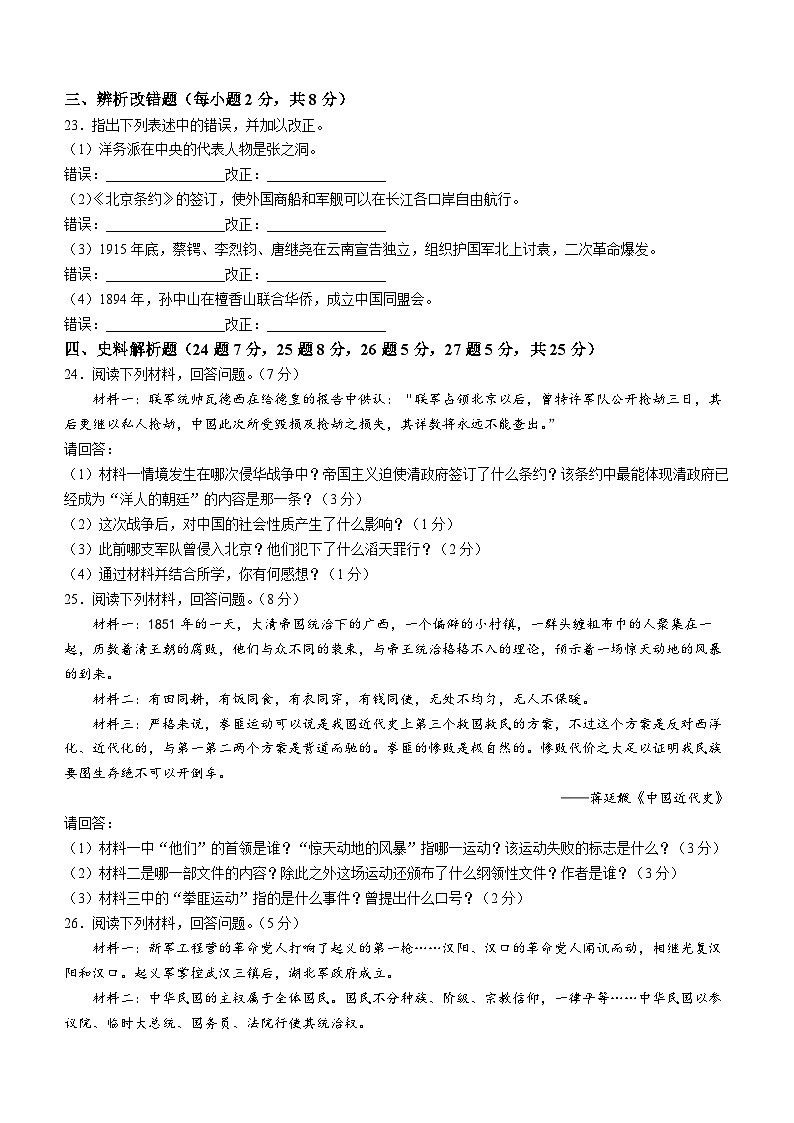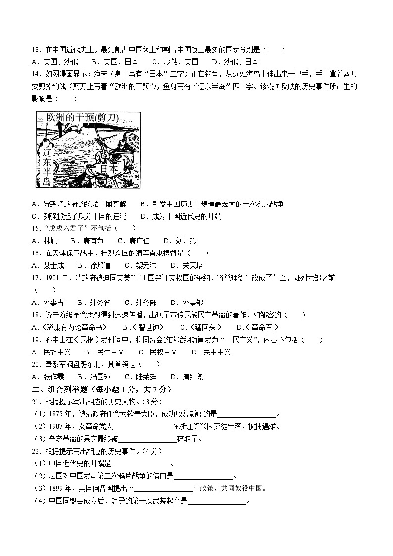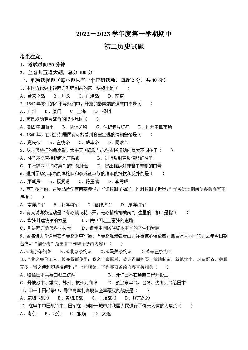 黑龙江省鸡西市第一中学校2022-2023学年八年级上学期期中历史试题