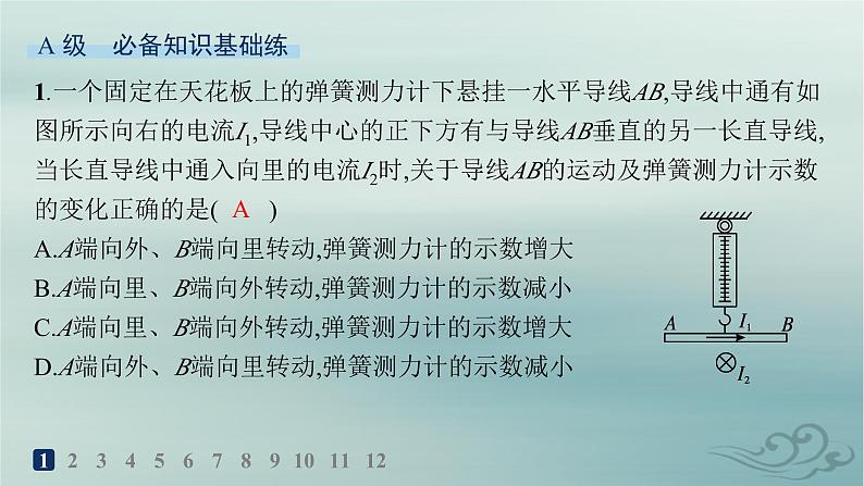 1.一个固定在天花板上的弹簧测力计下悬挂一水平导线AB,导线中通有如图所示向右的电流I1,导线中心的正下方有与导线AB垂直的另一长直导线,当长直导线中通入向里的电流I2时,关于导线AB的运动及弹簧测力计示数的变化正确的是( )A.A端向外、B端向里转动,弹簧测力计的示数增大B.A端向里、B端向外转动,弹簧测力计的示数减小C.A端向里、B端向外转动,弹簧测力计的示数增大D.A端向外、B端向里转动,弹簧测力计的示数减小