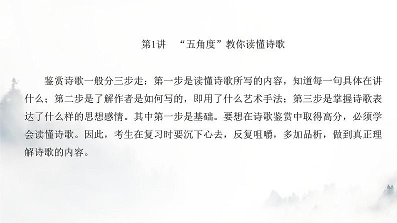 第1讲 “五角度”教你读懂诗歌鉴赏诗歌一般分三步走:第一步是读懂诗歌所写的内容,知道每一句具体在讲什么;第二步是了解作者是如何写的,即用了什么艺术手法;第三步是掌握诗歌表达了什么样的思想感情。其中第一步是基础。要想在诗歌鉴赏中取得高分,必须学会读懂诗歌。因此,考生在复习时要沉下心去,反复咀嚼,多加品析,做到真正理解诗歌的内容。