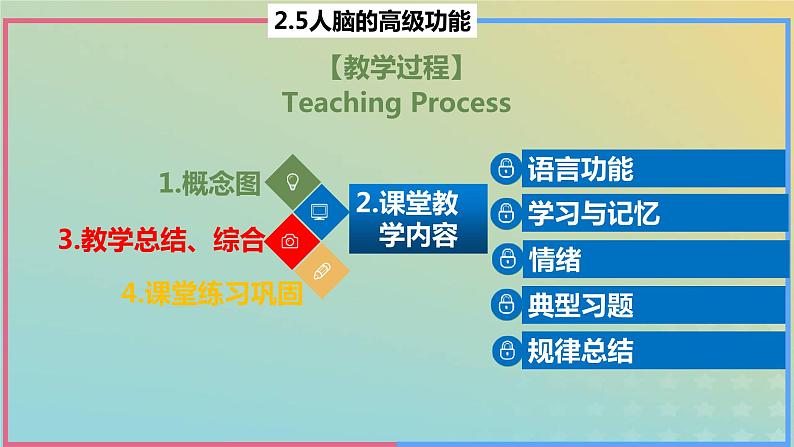 这是一份高中生物人教版 (2019)选择性必修1第2章 神经调节第5节 人脑的高级功能备课课件ppt,共50页。PPT课件主要包含了教学过程,概念图,课堂练习巩固,典型习题,规律总结,语言功能,学习与记忆,5人脑的高级功能,阿尔兹海默病简介,问题探讨等内容,欢迎下载使用。