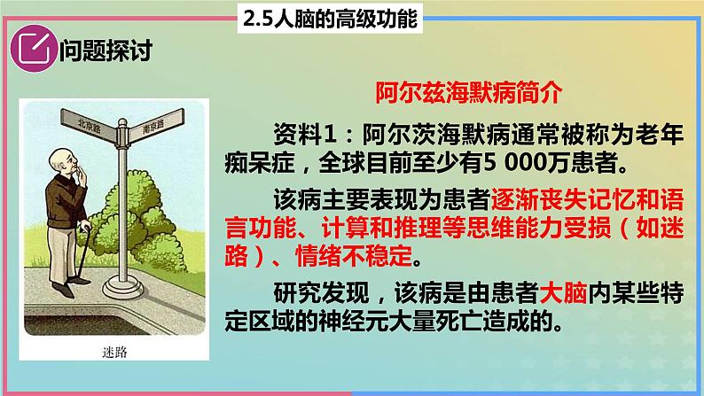资料1:阿尔茨海默病通常被称为老年痴呆症,全球目前至少有5 000万患者。 该病主要表现为患者逐渐丧失记忆和语言功能、计算和推理等思维能力受损(如迷路)、情绪不稳定。 研究发现,该病是由患者大脑内某些特定区域的神经元大量死亡造成的。