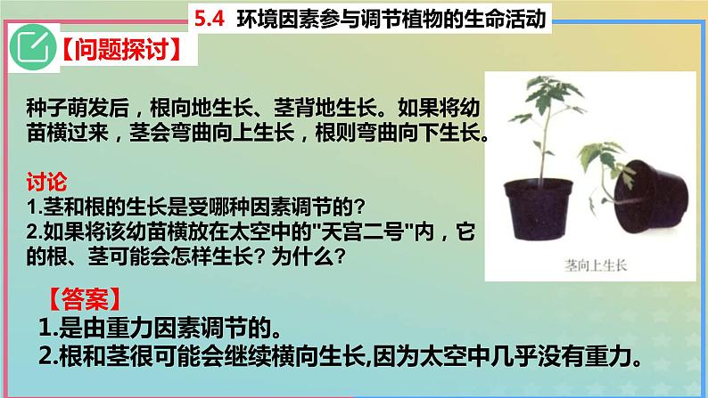 种子萌发后,根向地生长、茎背地生长。如果将幼苗横过来,茎会弯曲向上生长,根则弯曲向下生长。讨论1.茎和根的生长是受哪种因素调节的?2.如果将该幼苗横放在太空中的"天宫二号"内,它的根、茎可能会怎样生长? 为什么?