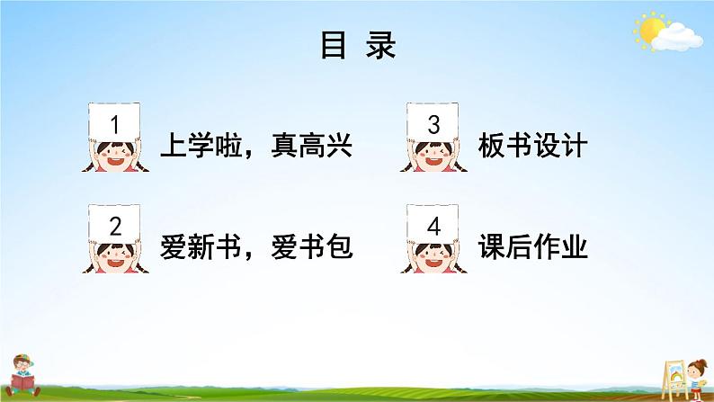 这是一份小学政治 (道德与法治)1 开开心心上学去教学ppt课件,共21页。PPT课件主要包含了上学啦真高兴,爱新书爱书包,谜底书包,板书设计,开开心心上学去,课后作业等内容,欢迎下载使用。