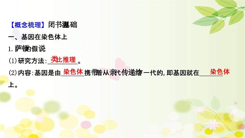 【概念梳理】闭书测基础一、基因在染色体上1.萨顿的假说:(1)研究方法:_________。(2)内容:基因是由_______携带着从亲代传递给下一代的,即基因就在_______上。
