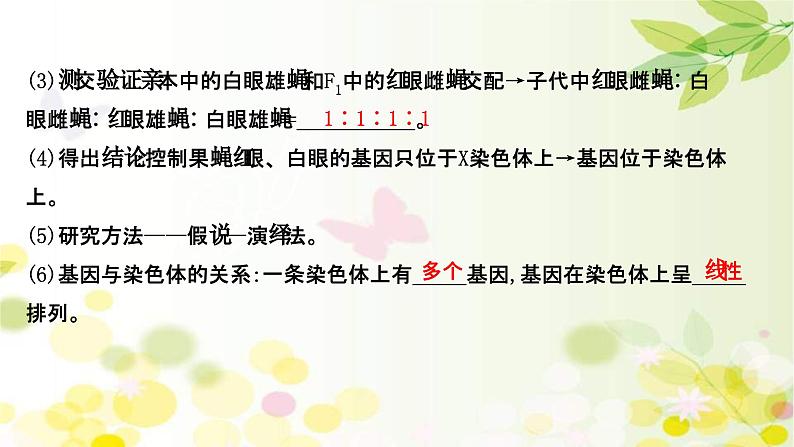 (3)测交验证:亲本中的白眼雄蝇和F1中的红眼雌蝇交配→子代中红眼雌蝇∶白眼雌蝇∶红眼雄蝇∶白眼雄蝇=___________。(4)得出结论:控制果蝇红眼、白眼的基因只位于X染色体上→基因位于染色体上。(5)研究方法——假说—演绎法。(6)基因与染色体的关系:一条染色体上有_____基因,基因在染色体上呈_____排列。