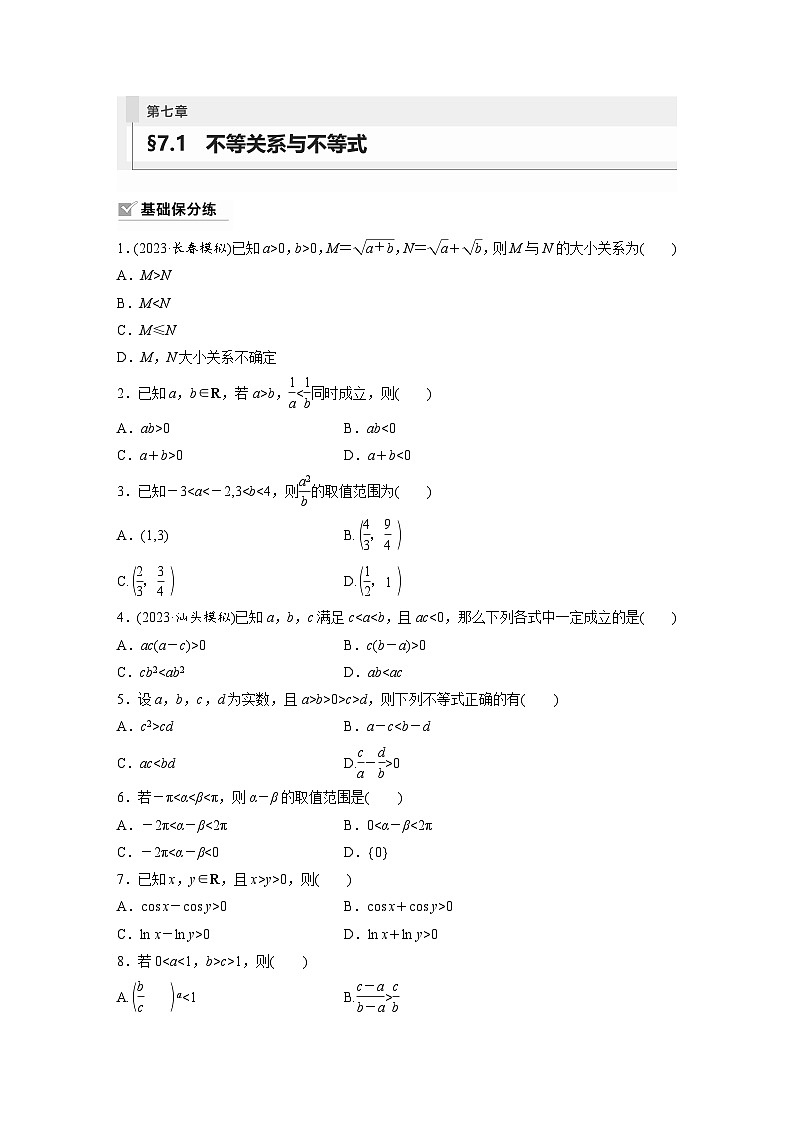 2024年数学高考大一轮复习第七章 §7.1 不等关系与不等式(附答单独案解析)