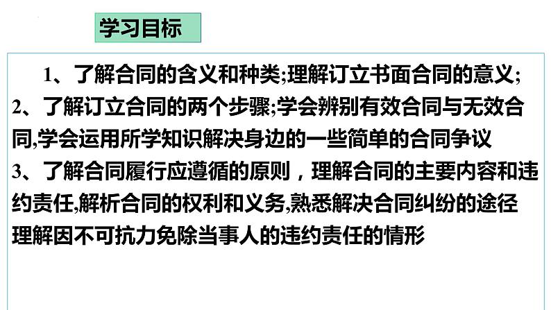 这是一份第三课订约履约诚信为本课件-2024届高考政治一轮复习统编版选择性必修二法律与生活,共35页。PPT课件主要包含了体系构建,考纲考情分析,议学情境,核心考点一,订立合同学问大,生活离不开合同,突破拓展,要约承诺订合同,标的和标的物的区别,区分要约与要约邀请等内容,欢迎下载使用。