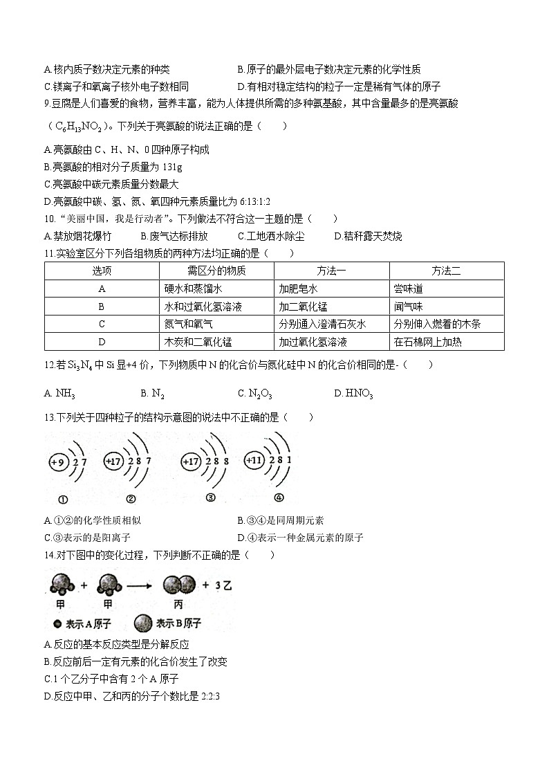 2021—2022学年度第一学期期中质量检测九年级化学试卷答题时可能用到的相对原子质量:C-12;H-1;O-16一、选择题:每小题只有1个正确选项符合题意(本题共20个小题,每小题2分,共40分)1.生活中的下列现象属于化学变化的是( )A.电灯通电发光 B.菜刀生锈 C.石蜡熔化 D.轮胎爆炸2.下列对于宏观现象的微观解释中不正确的是( )A.水变成水蒸汽是因为分子的体积变大B.水通电分解是因为分子在化学变化中可以再分C.水银温度计示数上升是因为汞原子间隔变大D.闻到花香是因为分子在不断地运动3.下列关于空气各成分的叙述,正确的是( )A.氧气的化学性质比较活泼,可以与许多物质发生氧化反应B.稀有气体的化学性质不活泼,常用于霓虹灯C.空气质量检测报告中,空气质量级别越大,空气质量越好D.二氧化碳在空气中的含量增多会引起温室效应,属于空气污染物4.下列关于水的说法不正确的是( )A.冰是由氢元素和氧元素组成的 B.长期饮用蒸馏水不利于人体健康C.使用明矾可以降低水的硬度 D.净化水的方法有吸附、沉淀、过滤和蒸馏等5.下列实验操作正确的是( )A.读取液体体积 B.倾倒液体C.滴加液体 D.加热固体6.下列化学用语书写正确的是( )A.保持氧气化学性质的最小微粒:O B.碳酸铵:C.2个氮分子:2N D.镁离子:7.下列有关实验现象描述不合理的( )A.木炭在氧气中燃烧生成二氧化碳 B.硫在氧气中燃烧产生明亮的蓝紫色火焰C.红磷在空气中燃烧产生大量白烟 D.铁丝在氧气中燃烧火星四射、生成黑色固体8.物质的组成、结构和性质的关系中,不正确的是( )A.核内质子数决定元素的种类 B.原子的最外层电子数决定元素的化学性质C.镁离子和氧离子核外电子数相同 D.有相对稳定结构的粒子一定是稀有气体的原子9.豆腐是人们喜爱的食物,营养丰富,能为人体提供所需的多种氨基酸,其中含量最多的是亮氨酸()。下列关于亮氨酸的说法正确的是( )A.亮氨酸由C、H、N、0四种原子构成B.亮氨酸的相对分子质量为131gC.亮氨酸中碳元素质量分数最大D.亮氨酸中碳、氢、氮、氧四种元素质量比为6:13:1:210.“美丽中国,我是行动者”。下列做法不符合这一主题的是( )A.禁放烟花爆竹 B.废气达标排放 C.工地洒水除尘 D.秸秆露天焚烧11.实验室区分下列各组物质的两种方法均正确的是( )选项需区分的物质方法一方法二A硬水和蒸馏水加肥皂水尝味道B水和过氧化氢溶液加二氧化锰闻气味C氮气和氧气分别通入澄清石灰水分别伸入燃着的木条D木炭和二氧化锰加过氧化氢溶液在石棉网上加热12.若中Si显+4价,下列物质中N的化合价与氮化硅中N的化合价相同的是-( )A. B. C. D.13.下列关于四种粒子的结构示意图的说法中不正确的是( )A.①②的化学性质相似 B.③④是同周期元素C.③表示的是阳离子 D.④表示一种金属元素的原子14.对下图中的变化过程,下列判断不正确的是( )A.反应的基本反应类型是分解反应B.反应前后一定有元素的化合价发生了改变C.1个乙分子中含有2个A原子D.反应中甲、乙和丙的分子个数比是2:2:315.下列说法完全正确的是( )A氖气的化学式——Ne1个硅原子——Si1个钠离子——B决定元素种类——质子数决定元素化学性质——最外层电子数决定元素在周期表中的周期序数——电子层数C铁——由分子构成二氧化碳——由原子构成硫酸铜——由离子构成D分子——化学变化中的最小粒子原子——保持物质化学性质的最小粒子离子——带电的原子或原子团16.下列推理不正确的是( )①氢气密度比空气密度小,可以用向下排空气法收集,所以密度比空气小的气体都可以用向下排空气法收集;②元素的种类相同是由于原子的质子数相同,质子数相同的粒子就是同种元素;③催化剂在反应前后质量不变,因此反应前后质量不变的物质一定是催化剂;④单质中只含有一种元素,但只含有一种元素的物质不一定是单质;⑤氧化物都含有氧元素,所以含有氧元素的化合物一定是氧化物A.③⑤ B.①②④ C.③④⑤ D.①②③⑤17.已知A、B、C、D四种元素的化合价依次为+1、+3、-1、-2,则A、B、C、D四种元素中的两种元素所组成的化合物的化学式不正确的是( )A.AC B.AD C. D.18.在密闭容器中各物质在反应前后质量变化如下,关于此反应认识不正确的是( ) ABCD反应前物质的质量(g)3030300反应后物质的质量(g)待测33022A.C中所含元素种类与A、B、D三种物质中所含元素种类相同B.C不可能是单质C.A可能是该反应的催化剂D.反应中C与D的质量比为15:1119.某小组充分加热一定量的和固体混合物制取氧气,下图中X轴表示反应时间,Y轴表示该反应中有关量,其中能正确表示的关系是( )A.剩余固体中质量分数 B.剩余固体中氧元素的质量C.剩余固体的质量分数 D.生成氧气的质量20.如图所示实验能达到目的的是( )A.检验是否集满 B.分离食盐和蔗糖C.证明蜡烛中含氢元素 D.红磷燃烧测定氧气含量二、填空与简答(本题共7个小题,共37分)21.用化学用语填空:①7个氮原子________②3个氢分子________③保持水化学性质的微粒________④空气中含量最多的元素________⑤氯化钠中的阳离子________⑥五个硝酸根离子________⑦碳酸钠________⑧氢氧化铝中铝元素的化合价________22.(1)在①澄清石灰水 ②氢气 ③二氧化氮 ④铜粉 ⑤清澈的海水 ⑥水 ⑦硫酸铜 ⑧氧化镁 ⑨矿泉水中,属于单质的有________(填序号,下同),属于化合物的是________,属于氧化物的有________。(2)右图是表示气体微粒的示意图,图中