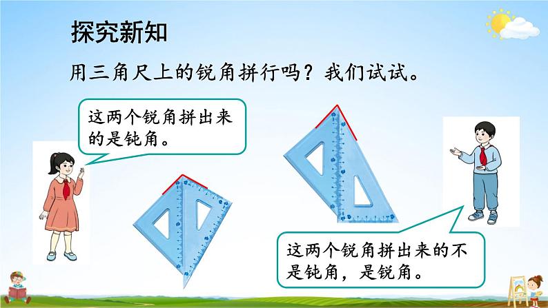 锐角和直角拼出的角一定是钝角;直角和直角拼出的角比钝角还大,是平角。