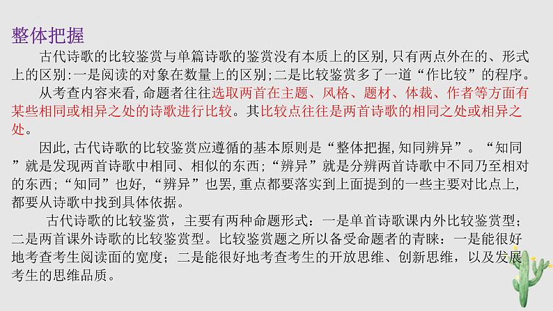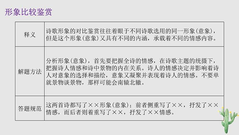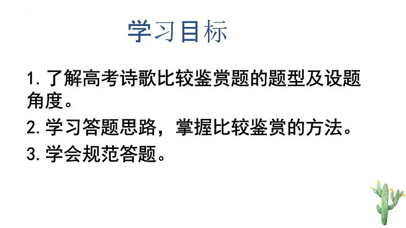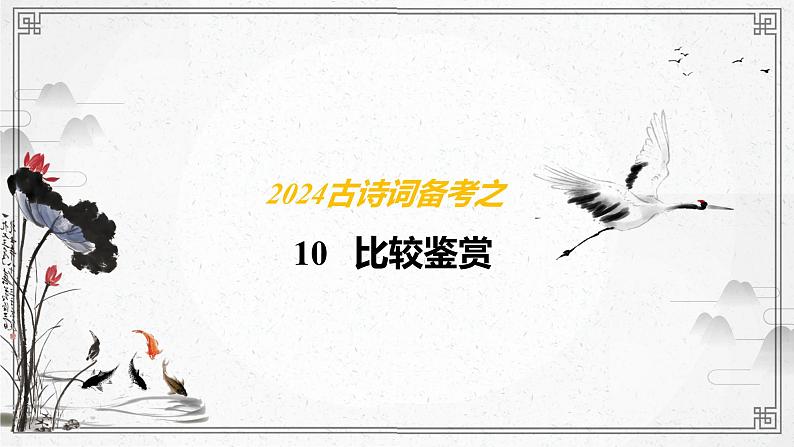 这是一份2024届高考古诗词备考之10比较鉴赏 课件,共36页。PPT课件主要包含了学习目标,比较鉴赏,比较诗歌的语言,形象比较鉴赏,语言比较鉴赏,比较鉴赏诗歌语言风格,表达技巧比较鉴赏,情感态度比较鉴赏等内容,欢迎下载使用。