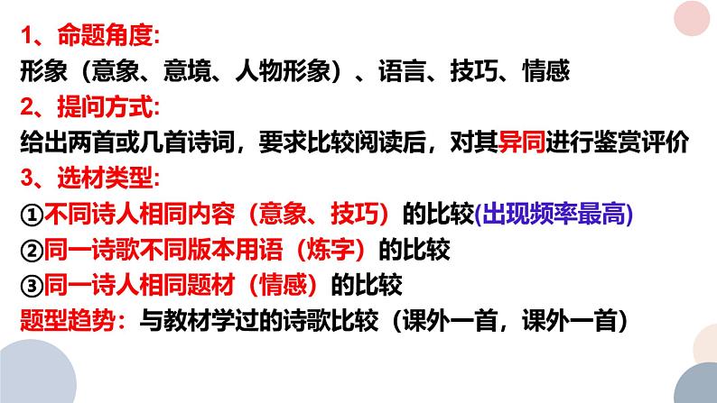 1.了解高考诗歌比较鉴赏题的题型及设题角度。2.学习答题思路,掌握比较鉴赏的方法。3.学会规范答题。