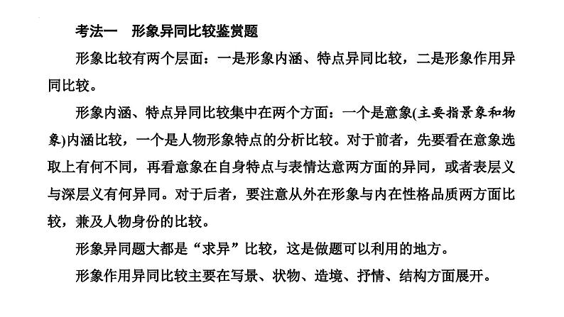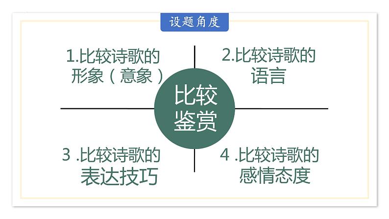 整体感知诗歌(关注标题、背景、注释、意象、注释)定位比较区间、方式以及比较点区间:是全诗的比较还是局部的比较,研读诗作对应的品评区;方式:是同中求异还是异中求同?还是辨析异同?比较点:景境情?表现手法?语言风格?分清条理、组织答案