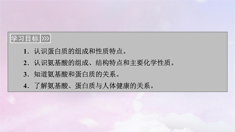 1.认识蛋白质的组成和性质特点。2.认识氨基酸的组成、结构特点和主要化学性质。3.知道氨基酸和蛋白质的关系。4.了解氨基酸、蛋白质与人体健康的关系。