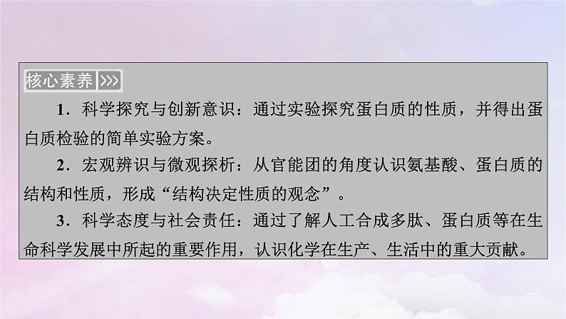 1.科学探究与创新意识:通过实验探究蛋白质的性质,并得出蛋白质检验的简单实验方案。2.宏观辨识与微观探析:从官能团的角度认识氨基酸、蛋白质的结构和性质,形成“结构决定性质的观念”。3.科学态度与社会责任:通过了解人工合成多肽、蛋白质等在生命科学发展中所起的重要作用,认识化学在生产、生活中的重大贡献。