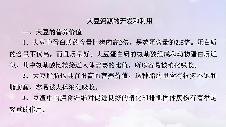 大豆资源的开发和利用一、大豆的营养价值1.大豆中蛋白质的含量比猪肉高2倍,是鸡蛋含量的2.5倍。蛋白质的含量不仅高,而且质量好。大豆蛋白质的氨基酸组成和动物蛋白质近似,其中氨基酸比较接近人体需要的比值,所以容易被消化吸收。2.大豆脂肪也具有很高的营养价值,这种脂肪里含有很多不饱和脂肪酸,容易被人体消化吸收。3.豆渣中的膳食纤维对促进良好的消化和排泄固体废物有着举足轻重的作用。