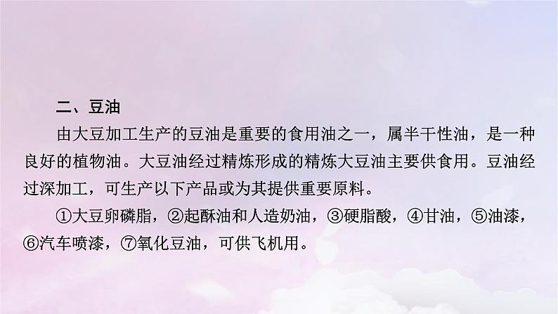 二、豆油由大豆加工生产的豆油是重要的食用油之一,属半干性油,是一种良好的植物油。大豆油经过精炼形成的精炼大豆油主要供食用。豆油经过深加工,可生产以下产品或为其提供重要原料。①大豆卵磷脂,②起酥油和人造奶油,③硬脂酸,④甘油,⑤油漆,⑥汽车喷漆,⑦氧化豆油,可供飞机用。
