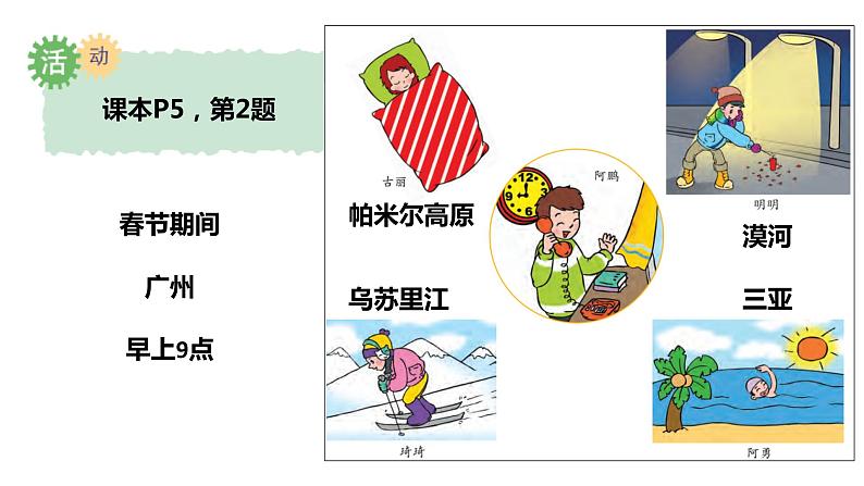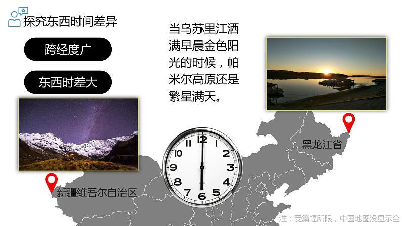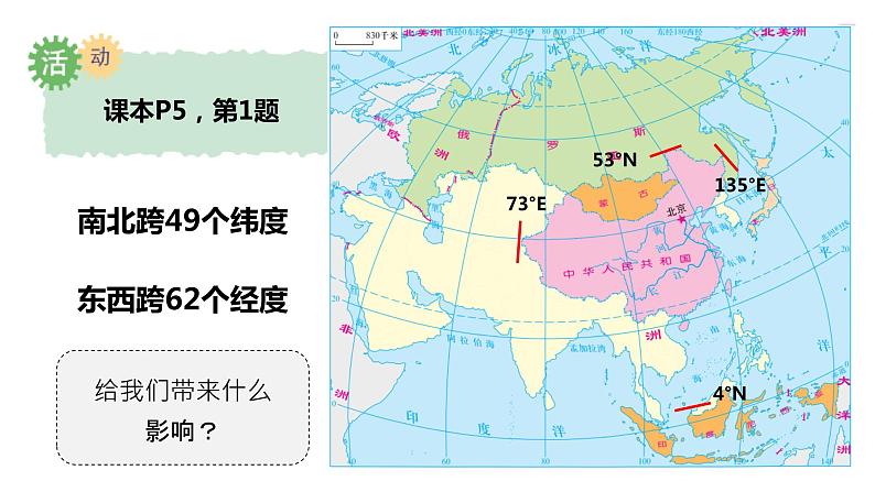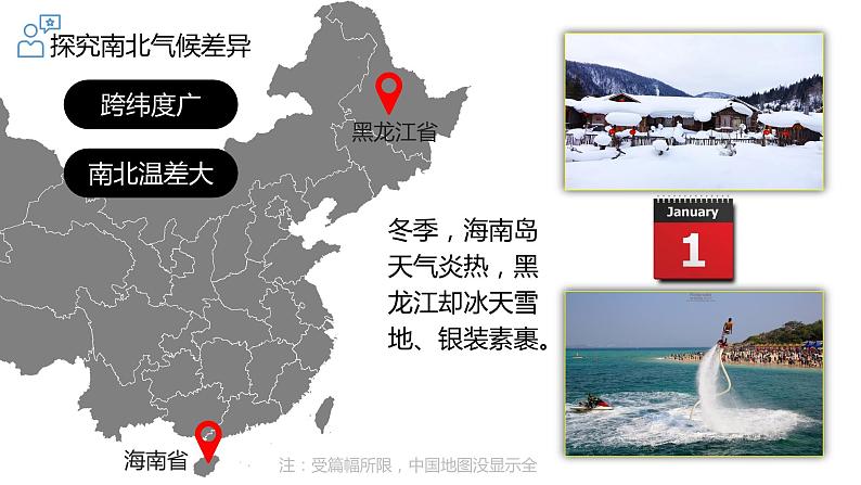 【创新课堂】八年级地理上册精品课件(粤人版)https://tv.cctv.com/2017/01/26/VIDEnDhaLyagJNhGyi4pmG6U170126.shtml?spm=C55924871139.PKgX4CXWWE68.0.0航拍中国宣传片位置和疆域粤教版·八上第一章第一节·第一课时经纬半球海陆最北53°N最南4°N最东135°E最西73°E北半球东半球亚洲东部太平洋西岸课本P5,第1题南北跨49个纬度东西跨62个经度给我们带来什么影响?黑龙江省海南省跨纬度广注:受篇幅所限,中国地图没显示全冬季,海南岛天气炎热,黑龙江却冰天雪地、银装素裹。南北温差大黑龙江省新疆维吾尔自治区晚上十点跨经度广注:受篇幅所限,中国地图没显示全当乌苏里江洒满早晨金色阳光的时候,帕米尔高原还是繁星满天。东西时差大春节期间广州早上9点帕米尔高原漠河乌苏里江三亚北纬40°-80°北温带、北寒带北纬4°-53°北温带北纬5°-南纬10°热带内陆国少、不便海陆兼备多、便利岛国多、便利背陆面海的海陆位置有利于国际交往和海洋事业发展大部分位于北温带,热量条件好适合动植物生长,有利多种农业经营海洋湿润气流充足带来丰沛降水,成为发展农业有利条件最东最西最北最南黑龙江与乌苏里江主航道中心汇合处帕米尔高原漠河以北曾母暗沙直线距离约5200千米直线距离约5500千米指领土的范围或面积领陆领水领空960多万平方千米2.2多万千米14个300多万平方千米1.8多万千米6个朝俄蒙在北边哈吉塔在冒汗尼巴印上挂不丹缅甸老挝靠越南6个隔海相望韩日菲印尼马来还有文莱内水内海指深入大陆内部,除了有狭窄水道跟外海或大洋相通外,四周被大陆内部、半岛、岛屿或群岛包围的海域。看视频,标地图钓鱼岛黄岩岛__________海岛数量11000余个 当灿烂的太阳跳出东海的碧波,帕米尔高原依然是群星闪烁,当北国还是银装素裹的世界,南疆早已洋溢着盎然的春色……多想用脚步丈量,亲自走过我国的东西南北,在每一处极点留下足迹,与每一处界碑合影留念,将一千二百多万平方公里的辽阔看在眼里,记于心中。