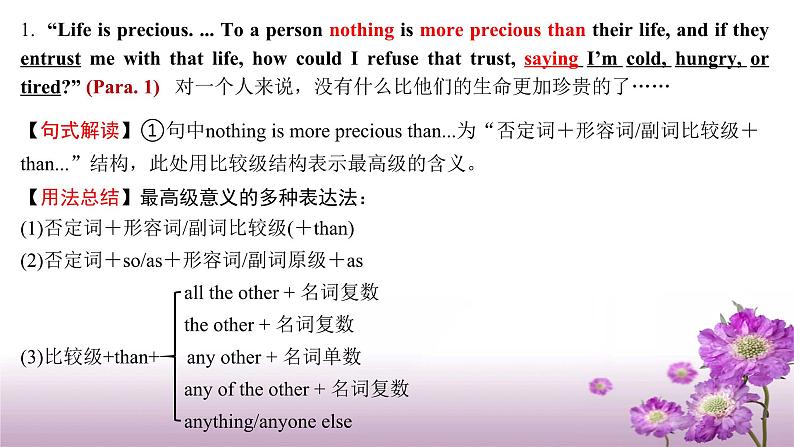 【句式解读】①句中nthing is mre precius than...为“否定词+形容词/副词比较级+than...”结构,此处用比较级结构表示最高级的含义。【用法总结】最高级意义的多种表达法:(1)否定词+形容词/副词比较级(+than)(2)否定词+s/as+形容词/副词原级+as all the ther + 名词复数 the ther + 名词复数(3)比较级+than+ any f the ther + 名词复数 anything/anyne else