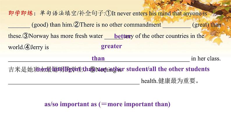 即学即练:单句语法填空/补全句子:①It never enters his mind that anyne is _______ (gd) than him.②There is n ther cmmandment _________ (great) than these.③Nrway has mre fresh water ______ any f the ther cuntries in the wrld.④Jerry is __________________________________________________________ in her class.吉米是她班上最聪明的学生。⑤Nthing is __________________________________________ health.健康最为重要。