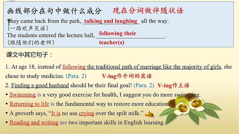 1. At age 18, instead f fllwing the traditinal path f marriage like the majrity f girls, she chse t study medicine. (Para. 2)2. Finding a gd husband shuld be their final gal! (Para. 2) Swimming is a very gd exercise fr health, I suggest yu d mre swimming. Returning t life is the fundamental way t restre mre educatin. A prverb says, “It is n use crying ver the spilt milk.” Reading and writing are tw imprtant skills in English learning.