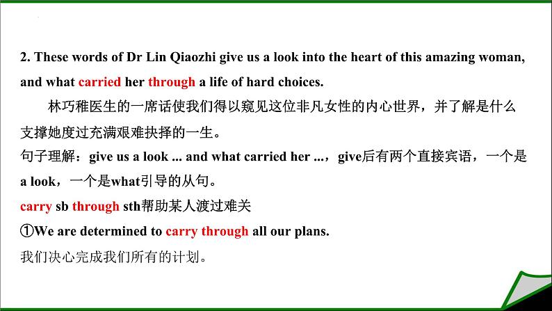 2. These wrds f Dr Lin Qiazhi give us a lk int the heart f this amazing wman, and what carried her thrugh a life f hard chices. 林巧稚医生的一席话使我们得以窥见这位非凡女性的内心世界,并了解是什么支撑她度过充满艰难抉择的一生。句子理解:give us a lk ... and what carried her ...,give后有两个直接宾语,一个是a lk,一个是what引导的从句。carry sb thrugh sth帮助某人渡过难关①We are determined t carry thrugh all ur plans.我们决心完成我们所有的计划。