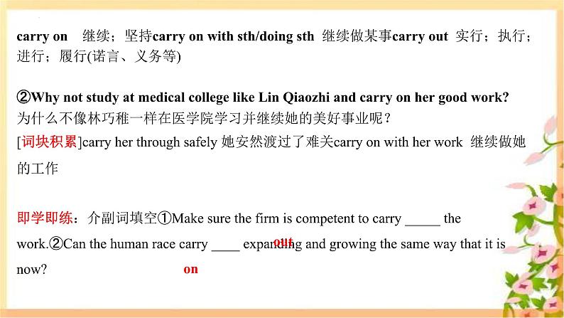 即学即练:介副词填空①Make sure the firm is cmpetent t carry _____ the wrk.②Can the human race carry ____ expanding and grwing the same way that it is nw?