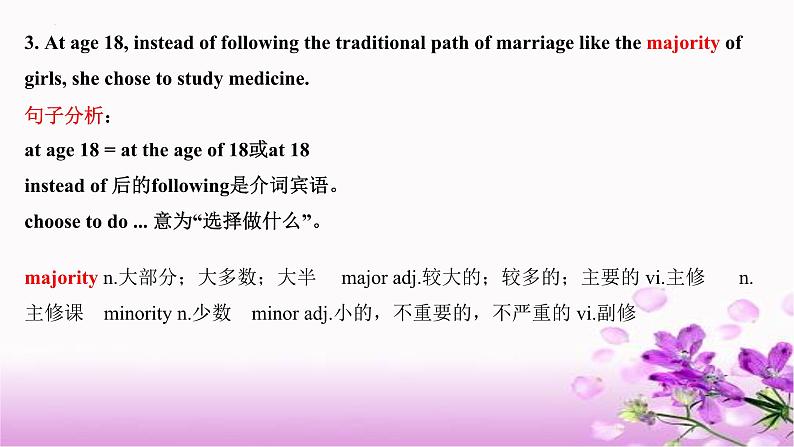 3. At age 18, instead f fllwing the traditinal path f marriage like the majrity f girls, she chse t study medicine.句子分析:at age 18 = at the age f 18或at 18instead f 后的fllwing是介词宾语。chse t d ... 意为“选择做什么”。