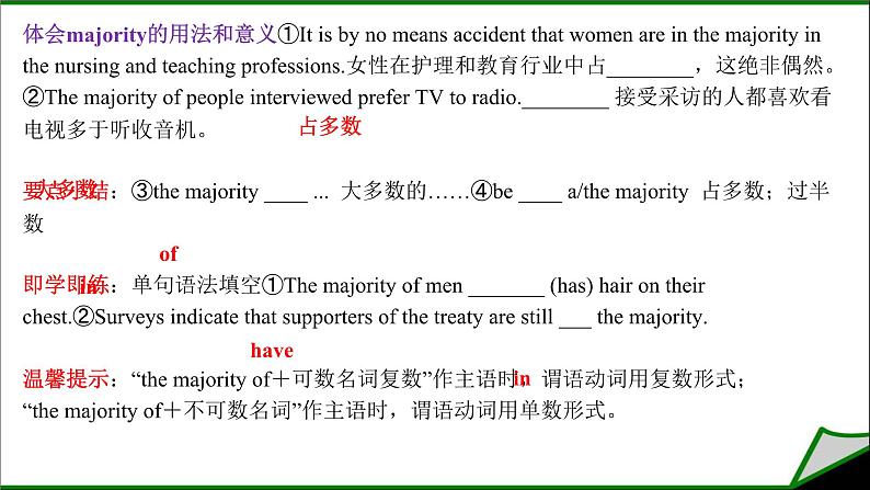 即学即练:单句语法填空①The majrity f men _______ (has) hair n their chest.②Surveys indicate that supprters f the treaty are still ___ the majrity.