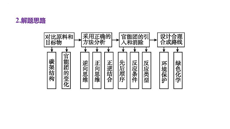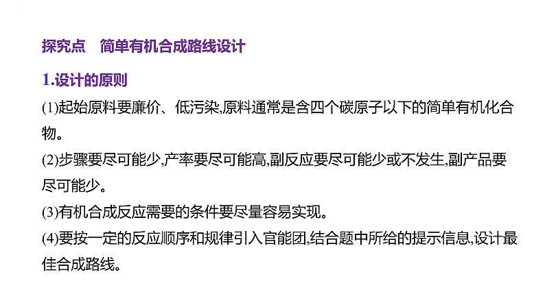 1.设计的原则(1)起始原料要廉价、低污染,原料通常是含四个碳原子以下的简单有机化合物。(2)步骤要尽可能少,产率要尽可能高,副反应要尽可能少或不发生,副产品要尽可能少。(3)有机合成反应需要的条件要尽量容易实现。(4)要按一定的反应顺序和规律引入官能团,结合题中所给的提示信息,设计最佳合成路线。