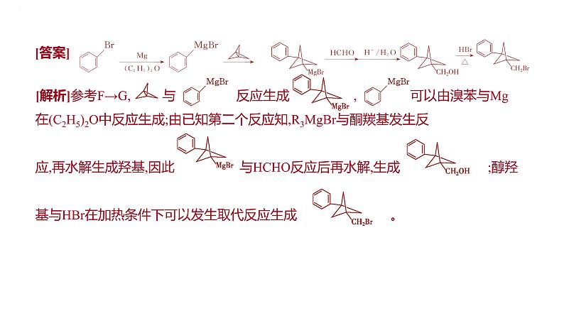 [解析]参考F→G, 与 反应生成 , 可以由溴苯与Mg在(C2H5)2O中反应生成;由已知第二个反应知,R3MgBr与酮羰基发生反应,再水解生成羟基,因此 与HCHO反应后再水解,生成 ;醇羟基与HBr在加热条件下可以发生取代反应生成 。