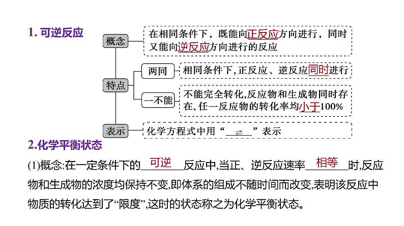 1. 可逆反应2.化学平衡状态(1)概念:在一定条件下的 反应中,当正、逆反应速率 时,反应物和生成物的浓度均保持不变,即体系的组成不随时间而改变,表明该反应中物质的转化达到了“限度”,这时的状态称之为化学平衡状态。