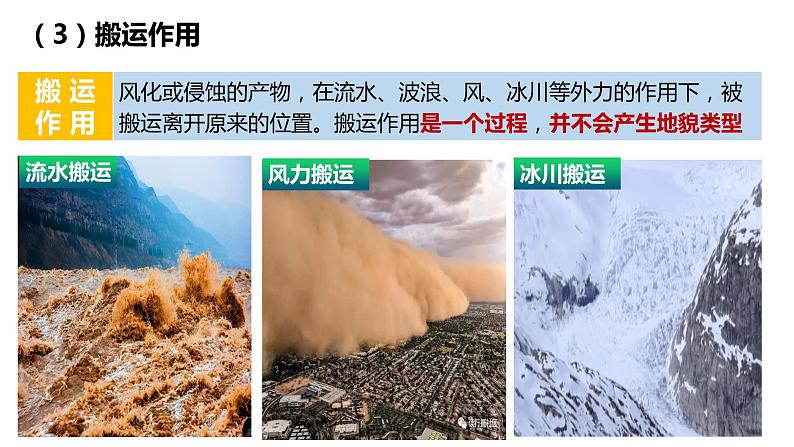 这是一份高中地理第一节 塑造地表形态的力量教学ppt课件,共19页。PPT课件主要包含了3搬运作用,①风力搬运,②流水搬运,③冰川搬运,4堆积作用,①风力沉积,三角洲,冲积扇,冲积平原,④海水沉积等内容,欢迎下载使用。