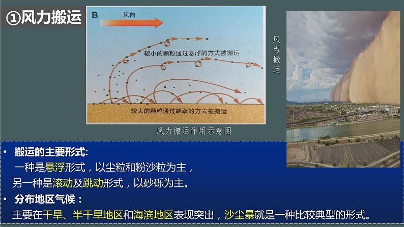 搬运的主要形式: 一种是悬浮形式,以尘粒和粉沙粒为主, 另一种是滚动及跳动形式,以砂砾为主。分布地区气候: 主要在干旱、半干旱地区和海滨地区表现突出,沙尘暴就是一种比较典型的形式。