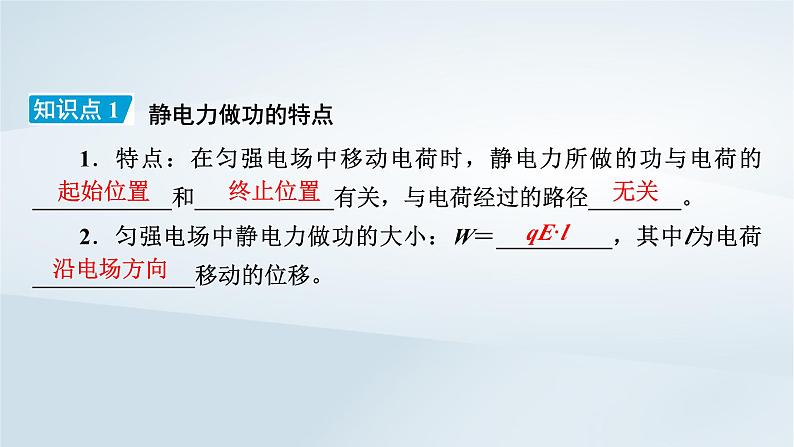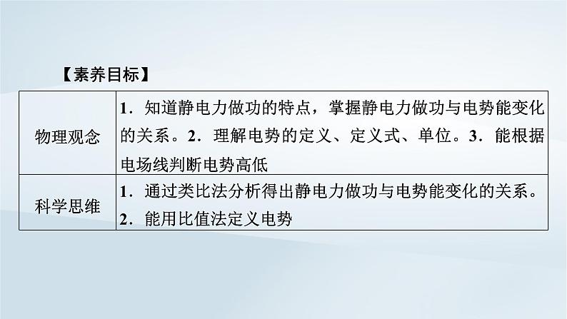 第十章 静电场中的能量1.电势能和电势目标体系构建【课程标准】1.知道静电力做功的特点。2.知道电势能的概念,认识电势能的相对性。3.理解静电力做功与电势能变化的关系。4.知道电势的定义和定义式、单位。【素养目标】课前预习反馈 静电力做功的特点1.特点:在匀强电场中移动电荷时,静电力所做的功与电荷的____________和____________有关,与电荷经过的路径________。2.匀强电场中静电力做功的大小:W=__________,其中l为电荷______________移动的位移。起始位置 知识点 1终止位置 无关 qE·l 沿电场方向 电势能1.概念电荷在________中具有的势能,用Ep表示。2.静电力做功与电势能变化的关系静电力做的功等于电势能的__________,WAB=__________。电场 知识点 2减少量 EpA-EpB 减少 增加 3.大小电荷在某点的电势能,等于把它从这点移动到______________时静电力做的功。4.零势能位置电场中规定的电势能为_____的位置,通常把离场源电荷________ ____或________的电势能规定为0。5.系统性电势能是相互作用的________所共有的,或者说是电荷及对它作用的________所共有的。零势能位置 0 无限远 处 大地 电荷 电场 电势1.定义:电荷在电场中某一点的电势能与它的__________的比值。2.公式:φ=______。3.单位:国际单位制中,电势的单位是________,符号是V,1 V=1 J/C。电荷量 知识点 3伏特 4.特点①相对性:电场中各点电势的高低,与所选取的零电势点的位置有关,一般情况下取____________或大地的电势为0。②标矢性:电势是标量,只有大小,没有方向,但有________。5.与电场线关系:沿着电场线方向电势____________。无限远处 正负 逐渐降低 『判一判』(1)只要电荷在电场中移动,电场力一定做功。 ( )(2)在匀强电场中将同一电荷移动同样的距离,静电力做功相同。 ( )(3)电势能既有正值,也有负值,是矢量。 ( )× × × (4)计算电势能时,不一定选取大地表面为零势能面。 ( )(5)电场力做功是电势能变化的原因,电场力做正功,电势能增加。 ( )(6)沿着电场线方向电势降低。 ( )(7)电势降低的方向就是电场方向。 ( )√ × √ × 『选一选』如图所示,两个等量异种电荷在真空中相隔一定距离,OO′代表两点电荷连线的中垂线,在两点电荷所在的某一平面上取图示1、2、3三点,则这三点的电势大小关系是 ( )A.φ1>φ2>φ3 B.φ2>φ1>φ3C.φ2>φ3>φ1 D.φ3>φ2>φ1A 解析:本题关键点是等量异种电荷周围的电场线和等势面的分布。先画出两等量异种电荷周围的电场线和等势面如图所示,根据沿着电场线方向电势越来越低,知φ1>φ2>φ3。『想一想』(1)为什么在实际应用中常取大地的电势为0?(2)孤立的正点电荷(或负点电荷)的电场中,各点电势的高低情况是怎样的?解析:(1)与实验室相比,地球体积巨大。实验器材中的电荷流入大地或从大地流出,对地球的电学状态几乎没有影响,地球电势十分稳定,因此常取大地的电势为0。(2)当规定无限远处为电势零点后,正电荷产生的电场中各点的电势均为正值,负电荷产生的电场中各点的电势均为负值,且越靠近正电荷的地方电势越高,越靠近负电荷的地方电势越低。课内互动探究探究我们知道重力做正功,物体的重力势能减小,其高度降低(如图甲);当重力做负功,物体的重力势能增大,其高度升高(如图乙)。那么当电场力做正功(或负功)时(如图丙),其电势能又是怎样变化的呢?对静电力做功、电势能的理解情景导入提示:电场力做正功(或负功)时,其电势能减小(或增大)。1.对静电力做功特点的理解(1)静电力对电荷所做的功,与电荷的初、末位置有关,与电荷经过的路径无关。该结论适用于任何静电场。(2)无论带电体在电场中做直线运动还是做曲线运动,无论带电体只受静电力作用还是受多个力作用,无论静电力做正功还是做负功,静电力做功的特点不变。要点提炼2.电势能的特点(1)电势能是由电场和电荷共同决定的,属于电荷和电场所共有的,我们习惯上说成电荷的电势能。(2)电势能是标量,有正负但没有方向,其正负表示大小。(3)电势能是相对的,其大小与选定的参考点有关。确定电荷的电势能,首先应确定参考点,也就是零势能点的位置。3.电势能增减的判断方法(1)做功判断法无论正、负电荷,只要电场力做正功,电荷的电势能一定减小;只要电场力做负功,电荷的电势能一定增大。(2)电场线判断法正电荷顺着电场线的方向移动时,电势能逐渐减小;逆着电场线的方向移动时,电势能逐渐增大。负电荷顺着电场线的方向移动时,电势能逐渐增大;逆着电场线的方向移动时,电势能逐渐减小。4.电势能与重力势能的比较典例剖析 如图所示,空间中的M、N处存在两个被固定的、等量同种正点电荷,在它们的连线上有A、B、C三点,已知MA=CN=NB,MA<NA。现有一正点电荷q,关于在电场中移动电荷q,下列说法中正确的是 ( )A.沿半圆弧l将q从B点移到C点,电场力不做功B.沿曲线r将q从B点移到C点,电势能减少C.沿曲线s将q从A点移到C点,电场力做负功D.沿直线将q从A点移到B点,电势能增加B 典题1思路引导:(1)明确两个点电荷周围电场的分布情况。(2)电场力做功与路径无关。(3)电场力做正功电势能减少;电场力做负功电势能增加。解析:电场是由M和N处两个点电荷的电场叠加而成的。电场力做功与路径无关,与初末位置有关。正电荷从B点到C点,N处的点电荷对其不做功,M处点电荷对其做正功,所以合电场力做正功,电势能减少,选项A错,B对;A点和B点关于两个等量正点电
