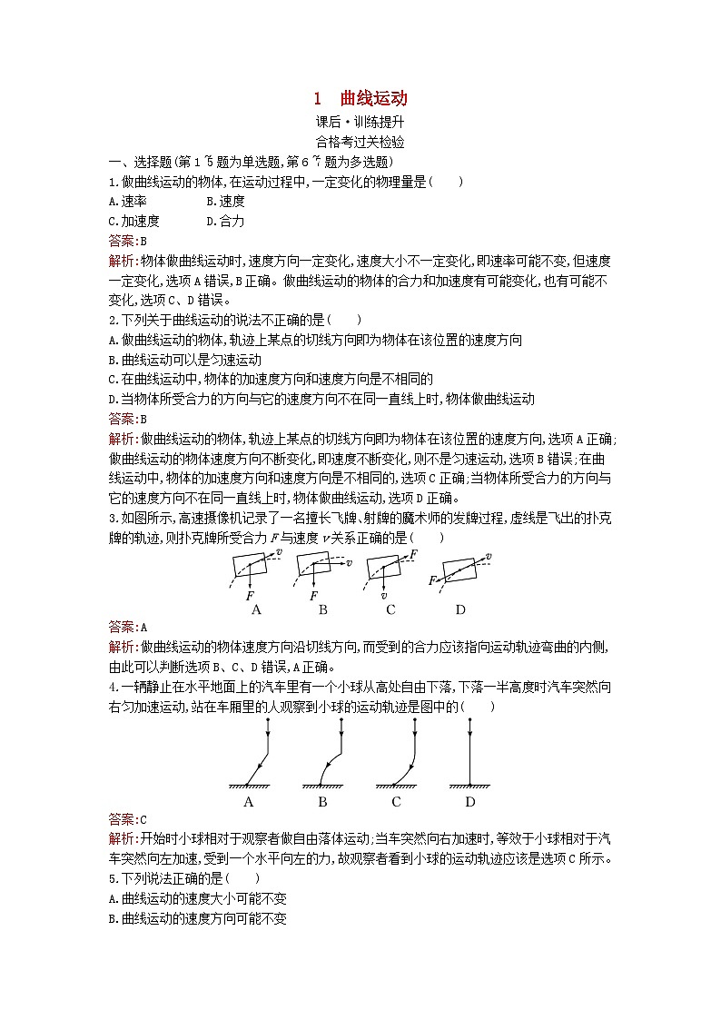 解析:物体做曲线运动时,速度方向一定变化,速度大小不一定变化,即速率可能不变,但速度一定变化,选项A错误,B正确。做曲线运动的物体的合力和加速度有可能变化,也有可能不变化,选项C、D错误。