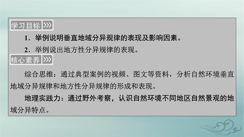 1.举例说明垂直地域分异规律的表现及影响因素。2.举例说出地方性分异规律的表现。综合思维:通过典型案例的视频、图文等资料,分析自然环境垂直地域分异规律和地方性分异规律的形成和表现。地理实践力:通过野外考察,认识自然环境不同地区自然景观的地域分异特点。
