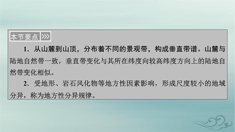 1.从山麓到山顶,分布着不同的景观带,构成垂直带谱。山麓与陆地自然带一致,垂直带变化与其所在纬度向较高纬度方向上的陆地自然带变化相似。2.受地形、岩石风化物等地方性因素影响,形成尺度较小的地域分异,称为地方性分异规律。